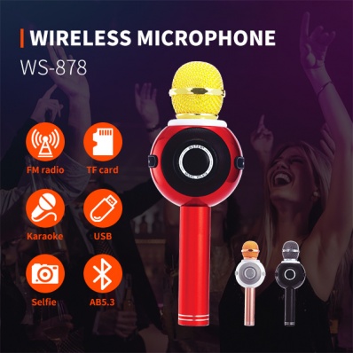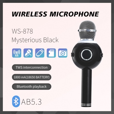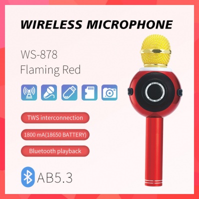 The WS-878 features an upgraded 1800mAh battery for longer usage time, a sleek cylindrical design (9×9.2×25.3cm), and comes in white, red, and black color options. Ideal for wireless karaoke microphone bluetooth 5.3.